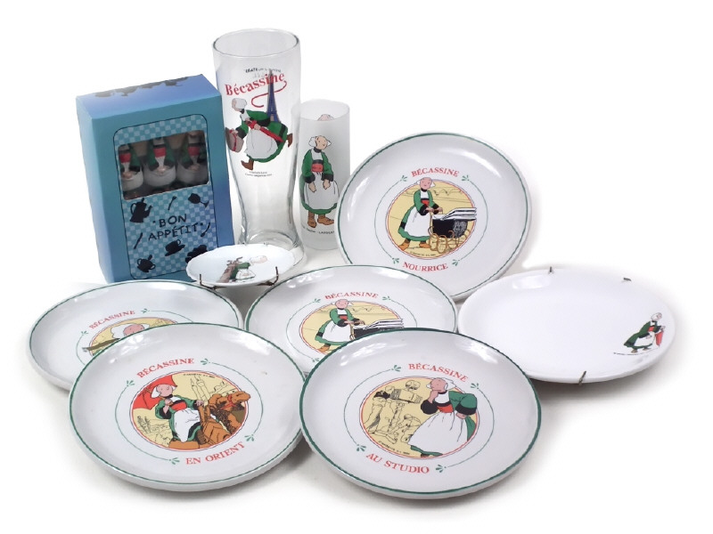 HACHETTE EDITIONS (FRANCE) Ensemble de 11 assiettes, 4 verres & un coffret de 3 couverts 'BECASSINE'