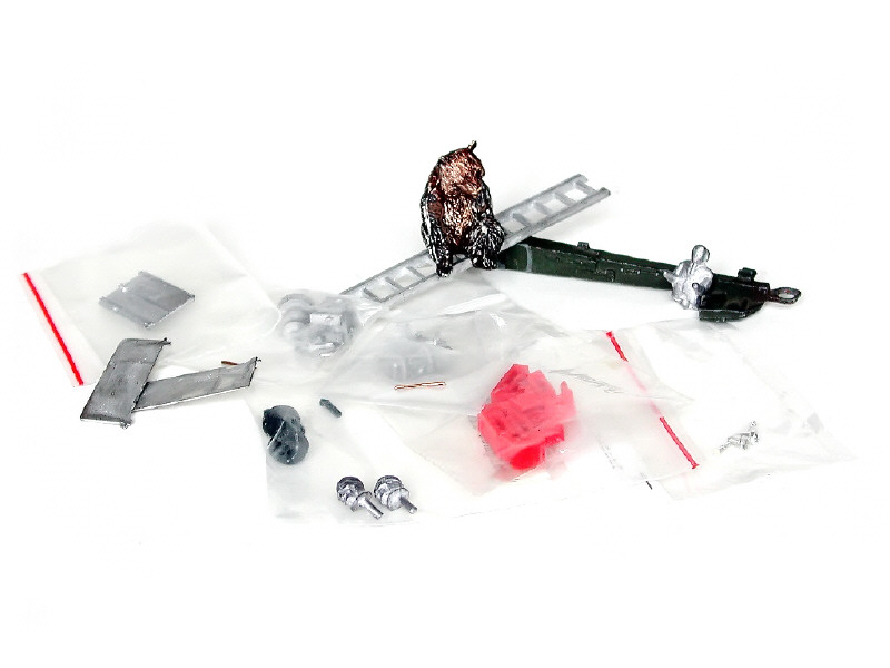 comprend : une trappe DUKW, têtes de pilote pour FERRARI, caméraman BBC, rétroviseurs, échelle, cales porte-autos, treuils & crochets GMC, ridelles arrière pour FORD/STUDEBAKER benne & élément d'obusier - on y retrouve les marques : DINKY-TOYS (FRANCE, GB) & LA BOITE A JOUETS - on y joint un ours BRITAINS