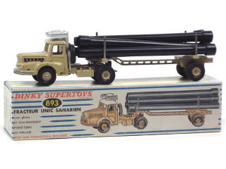 DINKY TOYS (FRANCE) 893 UNIC Saharien transport de pipe-lines (version avec jantes convexes & remorque ajourée) sable & blanc