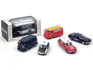 miniatures reproduisant notamment les modèles : CITROEN HY 'POLICE' (avec boîte), SIMCA 1100 'POLICE', ID19 ambulance de pompiers, RENAULT ESTAFETTE 'BOUILLON CUBE', RENAULT ESTAFETTE & CITROEN CX 'GENDARMERIE' - petits manques