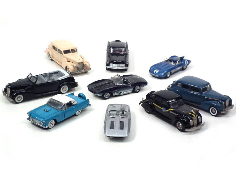 miniatures reproduisant notamment les modèles : CHEVROLET CORVETTE SS, MAKO SHARK, CHRYSLER AIRFLOW & CADILLAC V16 - on y retrouve les marques : AUTOART, FRANKLIN MINT & REXTOYS - petits manques & annotations sur certains planchers