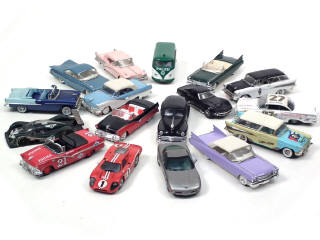 miniatures reproduisant notamment les modèles : CADILLAC 1959, CHEVROLET IMPALA, CHRYSLER WINDSOR, VOLKSWAGEN COMBI, BENTLEY SPEED 8, FORD MK IV - on y retrouve les marques : VITESSE, IXO, CITY & QUARTZO - petits manques - annotations & petits détails de peinture ajoutés sur les planchers