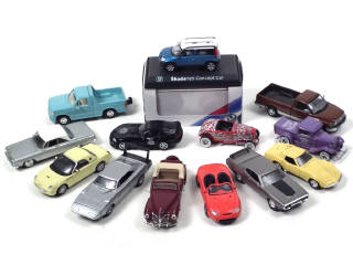 miniatures reproduisant notamment les modèles : PLYMOUTH BELVEDERE, GTX, SKODA YETI (avec boîte), CHEVROLET SILVERADO, DODGE RAM, CHARGER, VIPER & LINCOLN CONTINENTAL - on y retrouve notamment les marques : UNIVERSAL HOBBIES, MAISTO, HONGWELL & ANSON - un modèle en état 'E' avec importantes déformations de la carrosserie - annotations & détails de peinture ajoutés sur quelques planchers - petits manques