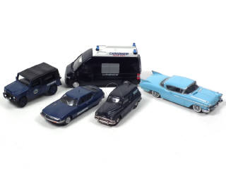 réalisations en résine - comprend : HEULIEZ, CITROEN SM, SIMCA ARONDE 'GENDARMERIE', FIAT 2.5D 'CARABINIERI' & CADILLAC 1958 - on y retrouve notamment les marques : GTS, ELYSEE, GIOCHER & GPS - quelques manques & parties non d'origine