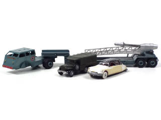 comprend : PACIFIC transport de fusée, DODGE 6x6 militaire & CITROEN DS19 - parties repeintes plus ou moins importantes - on y retrouve les marques : FRANCE JOUETS & JEP