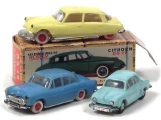 série 'MICRO MINIATURES' - miniatures reproduisant les modèles : CITROEN (en boîte 'd', manque un rivet), SIMCA (importantes fêlures sur la carrosserie) & RENAULT (quelques fêlures sur la carrosserie, une extrémité de plancher recollée avec rivet manquant)