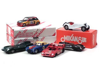 kits montés - réalisation en métal - comprend : AC16/90 1938 (avec éléments à refixer), LOTUS XI RECORD, LOTUS ELEVEN LE MANS 1957, ALFA ROMEO, LANCIA D20 & RENAULT 5 TURBO groupe 5 - on y retrouve notamment les marques : MIKANSUE, GRAND PRIX MODELS & MINI-RACING - 2 modèles avec boîte & une boîte vide supplémentaire MINI-RACING