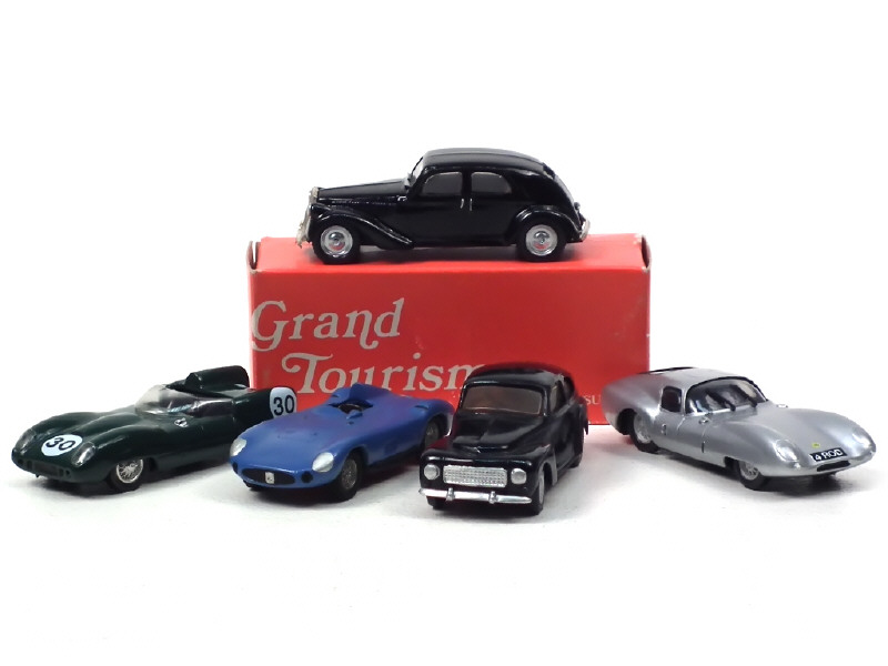kits montés - réalisation en métal - comprend les modèles : LANCI APRILLA (avec boîte en état 'c', quelques parties de vitrage endommagés), LOTUS XI coupé & LOTUS 15 - on y joint une MASERATI 300 S de la marque JOHN DAY (avec 3 petits éléments à refixer) & VOLVO PV 544