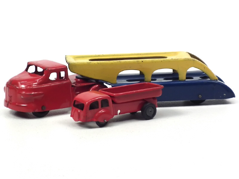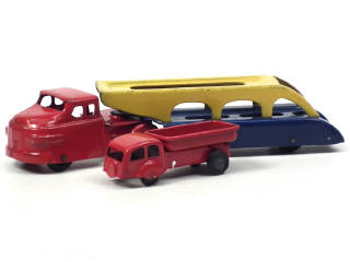 longueur 9 cm - un défaut de peinture sur le côté gauche de la cabine - on y joint un camion semi-remorque porte-autos de marque indéterminé en état 'D' (longueur 23 cm)