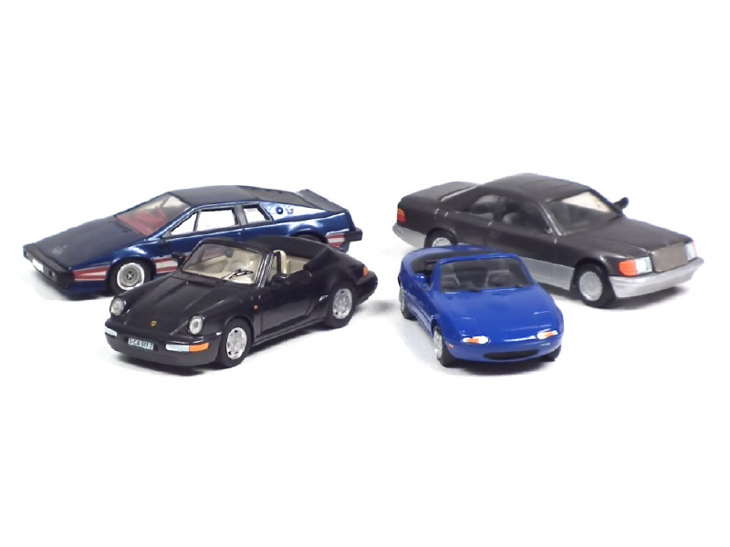 miniatures reproduisant les modèles : MAZDA SX-5 1989, MERCEDES 300 CE 1987, PORSCHE CARRERA 4 1989 & LOTUS ESPRIT - on y retrouve les marques : CENTURY & WESTERN MODEL - petits manques & parties à recoller
