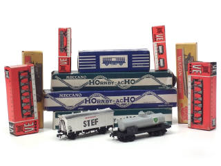 on y retrouve les marques : GEGE, HORNBY & JOUEF (HO-VE) - quelques manques - 2 boîtes en état 'c' & 2 autres en état 'd'