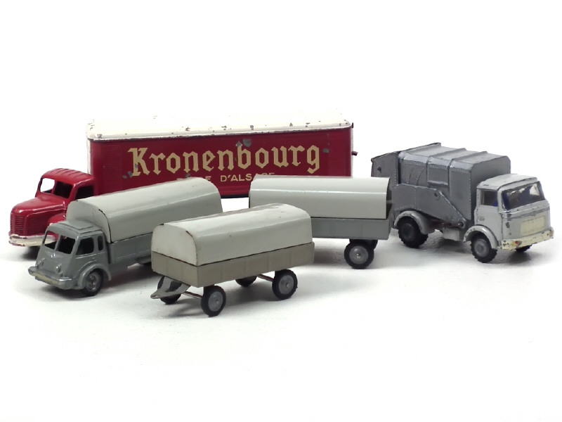 états de 'D' à 'E' - comprend : BERLIET semi-remorque 'KRONENBOURG' (JRD), GAK benne à ordures (FRANCE JOUETS) & RENAULT 7 tonnes avec remorque (C.I.J) - traces d'oxydation & parties repeintes - pneus séchés