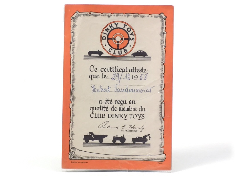 DINKY TOYS (GB) Certificat d'adhésion au Club DINKY TOYS