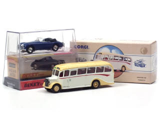 comprend JAGUAR XK 150 avec surboîte ouverte (MATTEL) & BEDFORD OB MEREDITH (CORGI TOYS) avec certificat d'édition limitée numérotée 1567/5000 exemplaires