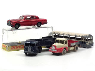 états de 'D' à 'E' - comprend : PANHARD semi-remorque (DINKY TOYS FRANCE), UNIC IZOARD tracteur routier (JRD), CHAUSSON autocar (DINKY TOYS FRANCE) & ROLLS ROYCE SILVER SHADOW (DINKY TOYS GB) (avec boîte en état 'e') - 3 pneus fondus - avec manques