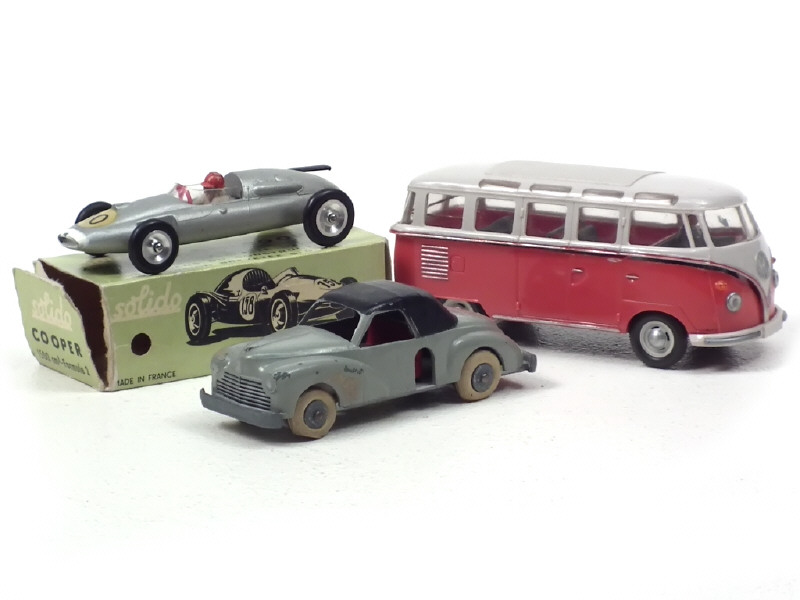 états de 'B' à 'D' - comprend : PEUGEOT 203 cabriolet (série BABY avec détails de peinture ajoutés & pneus séchés) & COOPER 1500 (avec boîte en état 'e') - on y joint un VOLKSWAGEN COMBI minibus de la marque WIKING (une trace de peinture argentée sur le pare-brise & axes de roues oxydés)