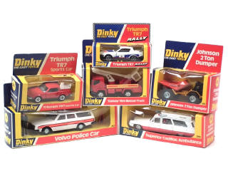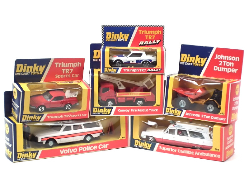 comprend notamment : JOHNSON DUMPER, TRIUMPH TR7 (2 exemplaires différents), CADILLAC ambulance (en état 'B' avec blister de boîte déchiré) & VOLVO 265 DL break police