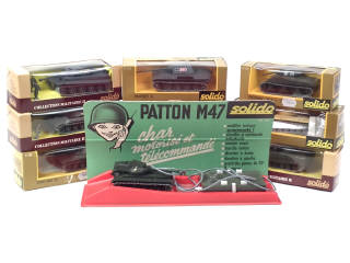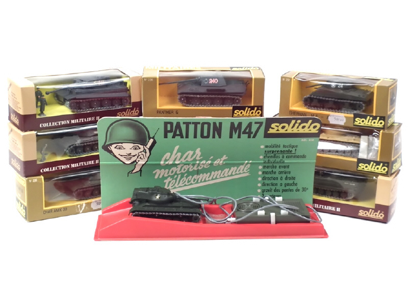 comprend : PANTHER, AMX 10, 13, 30 (2 exemplaires), SHERMAN M4, M41 (petites traces d'humidité par endroits), TIGRE I & PATTON (2 exemplaires différents dont un télécommandé non testé avec boîte légèrement tachée) - quelques accessoires manquants