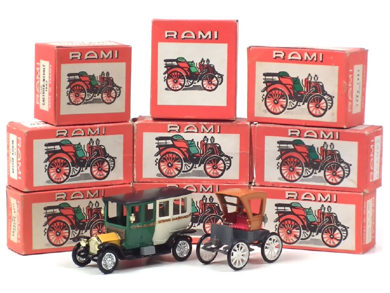 miniatures reproduisant les modèles : DEDION BOUTON (2 exemplaires, DELAHAYE, SCOTTE, GAUTHIER-WEHRLE (2 exemplaires), FORD, BERLIET (importantes manques de peinture sur le plancher), LION-PEUGEOT, PANHARD LEVASSOR & RENAULT - quelques parties chromées ternies & petites annotations sur certaines boîtes