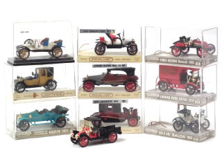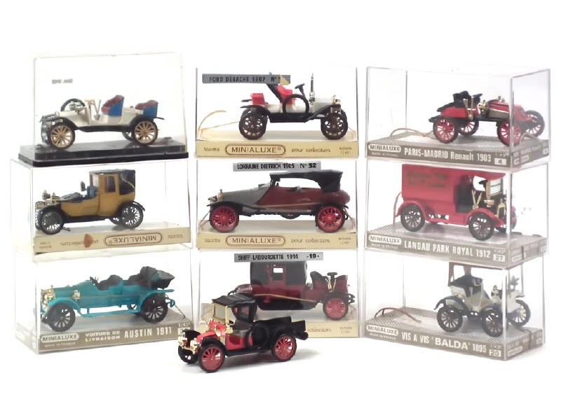 comprend : LORRAINE DIETRICH 1905, SKIFF LABOURDETTE 1914, LANDAU PARK ROYAL 1912, FORD 1907, RENAULT 1903, camion 1910, AUSTIN camion 1911, LANCHESTER 1908, PEUGEOT VIS A VIS (boîte non conforme) & 1906 (boîte JMK) - quelques traces d'élastiques séchés sur les boîtes