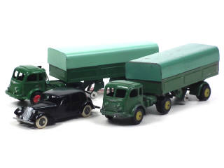 comprend : 2 RENAULT 120 CV semi-remorque bâché dont un en état 'E' avec pièces manquantes & une CITROEN TRACTION 11 CV (jantes ternies) - on y retrouve les marques : CIJ & JRD - 2 modèles avec jantes plus ou moins fondues