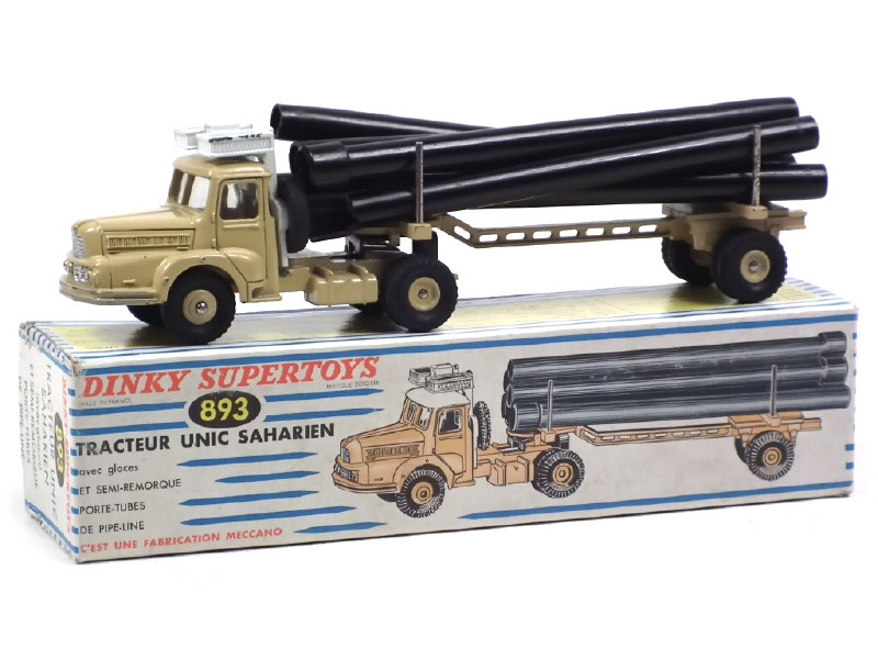 DINKY TOYS (FRANCE) 893 UNIC Saharien transport de pipe-lines (version avec jantes convexes & remorque ajourée) sable & blanc