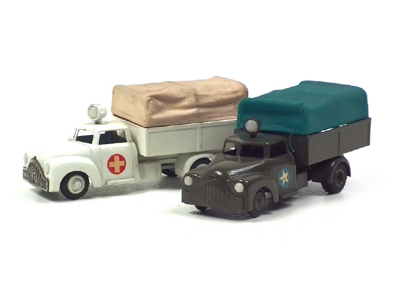 version avec projecteur directionnel sur le toit de la cabine, décalques des portières représentant une croix blanche sur fond rond rouge & calandre chromée ternie - absence de marquages latéraux sur le capot moteur - carrosserie & bâche encrassées