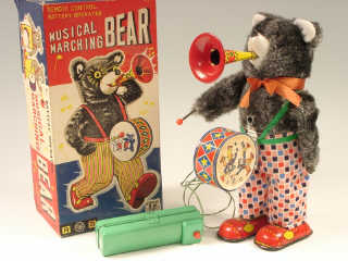référence 10C du livre de BRIAN MORAN 'BATTERY TOYS' - hauteur 27 cm - en action l'ours avance tout en tapant sur sa grosse caisse, bouge la tête & les yeux s'allument - mécanismes fonctionnent mais bruitage de la trompette à revoir - in action, the bear moves forward & bangs on his drum, his head moves & his eyes light up - in working condition - trumpet sound effects subject to verification
