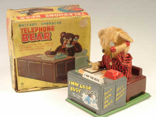 référence 12A du livre de BRIAN MORAN 'BATTERY TOYS' - hauteur 19 cm - en action l'ours écrit sur son bloc-notes tandis que le téléphone sonne & qu'il décroche le combiné - avec bruitage de voix - mécanismes fonctionnent poussivement - in action, the bear writes on his notepad, when the phone rings he picks up the receiver - with voice sound effects - mechanisms work wheezily