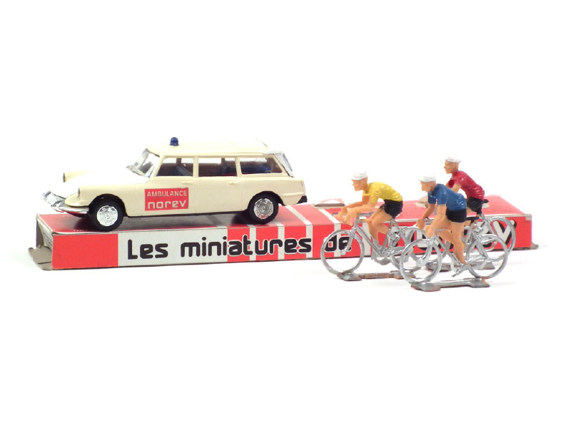 contient : une CITROEN ID 19 break ambulance 'AMBULANCE NOREV' & 3 coureurs cyclistes (décollés du socle) - CURIOSITE : les parties ouvrantes sont de couleur différente du reste de la carrosserie - 2 petites fêlures sur le vitrage - manque vraisemblablement enjoliveur de roue de secours & quelques petites parties de papier sur le socle