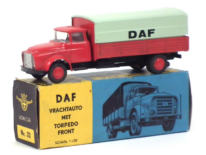 LION-CAR (PAYS-BAS) 32 DAF TORPEDO Camion-plateau bâché 'DAF' rouge & blanc