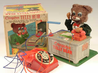 hauteur 20 cm - en action l'ours repond au téléphone puis raccroche - le mécanisme est déclenché par la numérotation sur le second combiné - mécanismes à revoir - in action, the bear answers the telephone, then hangs up - the mechanism works by dialling on the second 'phone - mechanism subject to verification