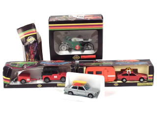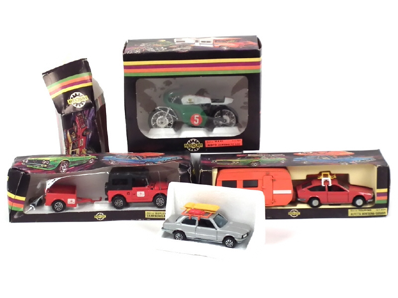 comprend : ALFA ROMEO (la caravane est en état 'C'), FIAT CAMPAGNOLA, BMW & YAMAHA - 4 modèles regroupés en 2 coffrets