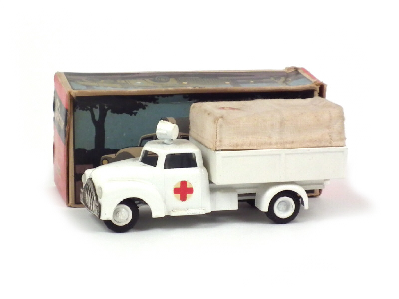 version avec projecteur directionnel sur le toit de la cabine, décalques des portières représentant une croix rouge sur fond rond blanc, calandre chromée (légèrement ternie) & absence de marquages latéraux sur le capot moteur - un défaut de moulage sur le plateau - bâche légèrement tachée