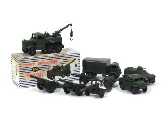 états de 'B' à 'C' - comprend : RECOVERY TRACTOR (en boîte état 'b' & tachée avec quelques petites traces d'oxydation sur le modèle), BEDFORD QL bâché, ARMOURED PERSONNEL CARRIER, FIELD ARTILLERY TRACTOR avec remorque, 5.5 MEDIUM GUN, 7.2 HOWITZER (2 exemplaires) & 25 POUNDER FIELD GUN (boîte état'c')