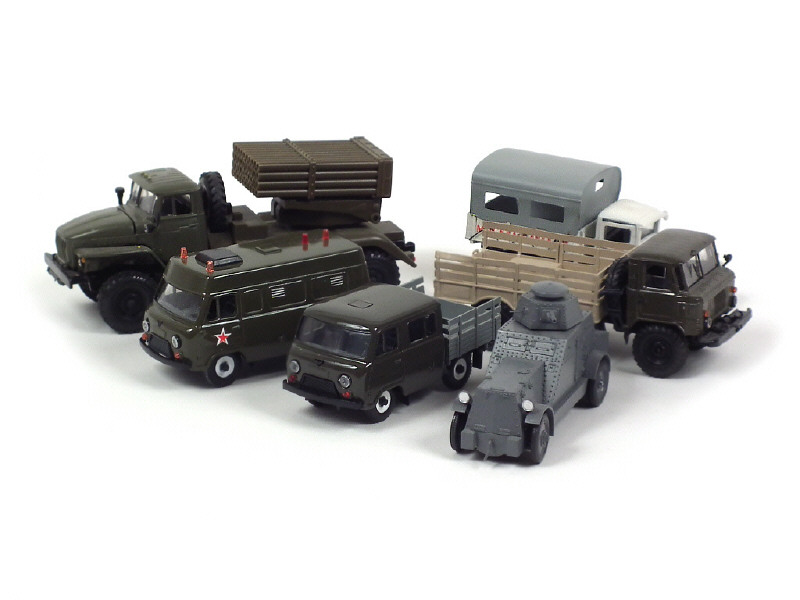 comprend notamment : minibus d'intervention, double-cabine semi plateau à ridelles, plateau à ridelles bâché (quelques éléments cassés & déformés), plateau lance-roquettes, plateau à ridelles (quelques parties cassées & déformées) & automitrailleuse - on y retrouve notamment les modèles : KAMAZ & GAS - quelques petits manques