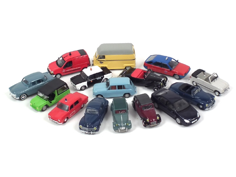 miniatures reproduisant les modèles : CITROEN (6 exemplaires différents, un pare-brise cassé), PEUGEOT (2 exemplaires différents), RENAULT (5 exemplaires différents, un pare-brise cassé) & SIMCA - on y joint une RENAULT ESTAFETTE de la marque CITY - quelques petits manques & pièces à recoller