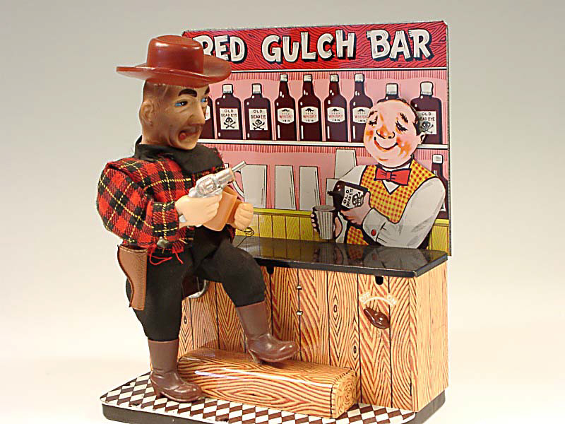référence 45B du livre de BRIAN MORAN 'BATTERY TOYS' - hauteur 25 cm - en action le cow-boy boit son verre tandis que son visage rougit - il tourne la tête puis tire avec son révolver - avec bruiteur - mécanismes fonctionnent - in action, as the cowboy drinks his drink his face turns red - he turns his head then shoots his revolver - with sound effects - in working condition