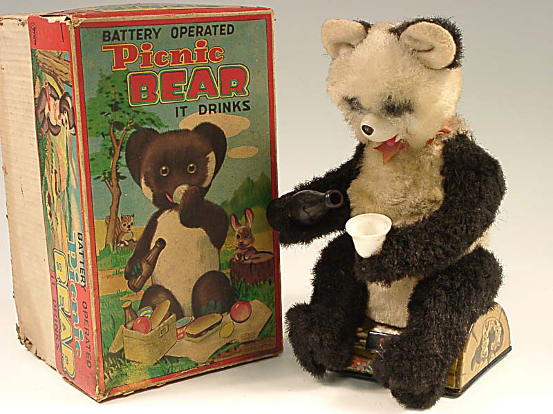 référence 21F du livre de BRIAN MORAN 'BATTERY TOYS' - hauteur 26 cm - en action l'animal rempli son verre de COCA-COLA puis le boit - la tête bouge & les yeux s'allument - mécanismes à revoir - in action, the animal fills his glass with COCA-COLA & drinks it - his head moves & his eyes light up - mechanism subject to verification