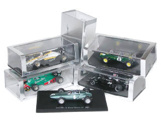 miniatures reproduisant les modèles : BRM P57 GP de Monaco 1963, LOTUS GP d'Italie 1963, SHADOW DN1 GP d'Espagne 1973, ALFA ROMEO 184T GP de France 1984 & RENAULT RE60 GP d'Allemagne 1985 - une surboîte état 'b'