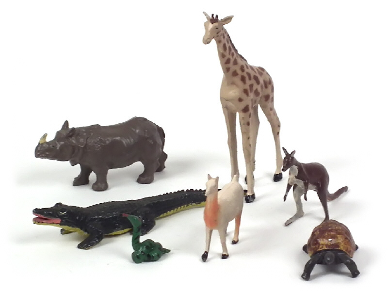 comprend : une girafe, rhinocéros, crocodile, kangourou, lama, tortue & serpent