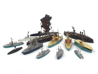 réalisation en différents métaux - états de 'B' à 'D' - comprend : 5 cuirassés, 4 croiseurs, 3 sous-marins (un modèle repeint) & un porte-avions - on y retrouve notamment la marque LR - avec manques & parties déformées