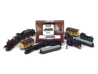 différentes échelles - comprend : 6 locomotives à vapeur (non testées dont une avec boîte), 2 avec tender & 4 voitures de voyageurs - on y retrouve notamment les marques : TRI-ANG, LILIPUT, JOUEF (une partie cassée à recoller) & MÄRKLIN - quelques modèles encrassés - on y joint 2 personnages de gare