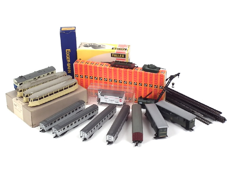 différentes échelles - comprend : 6 voitures de voyageurs, 5 wagons, une rame de trolley bus à 3 éléments (regroupé dans un coffret en état 'b'), une station-service avec pompes (en boîte état 'b'), un char LEOPARD & un ensemble de rails - on y retrouve notamment les marques : MÄRKLIN, FLEISCHMANN, EGGER-BAHN, LIMA, ARNOLD, WIKING & FALLER