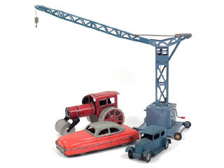 comprend : un rouleau compresseur (état 'C', manque cheminée, moteur à ressort (fonctionne), berline (état 'C', moteur à clef (fonctionne), parties chromées légèrement ternies), berline des années 30 (état 'B', carrosserie légèrement tachée, roues en partie repeintes) & grue mobile (état 'B', flêche en état 'C', moteur à clef (fonctionne), manque accessoire) - on y retrouve notamment les marques : JOUSTRA, MEMO & VEBE