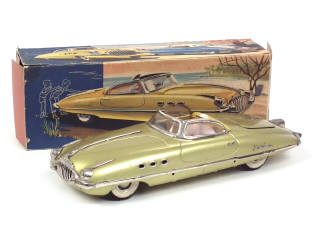 longueur 35 cm - avec direction par le volant, conducteur & levier de commandes - moteur à piles (non testé) - vitrage détaché par endroits avec petits manques - importants manque de peinture sur le volant - 2 barres de calandre (avec un petit enfoncement) légèrement endommagées - quelques parties chromées très légèrement ternies