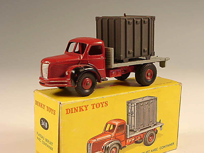 DINKY TOYS (FRANCE) 34B BERLIET Plateau avec container (version avec goupille) rouge, plateau gris clair