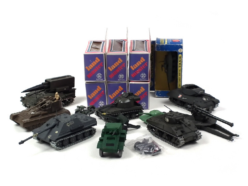 série 'LANDMANSTER' - échelle 1/87ème - comprend : CENTURION (3 exemplaires différents), TIGRE I (2 exemplaires différents) , JS III & CHIEFTAINE - sur socles de présentation (quelques fixations cassées) - une boîte en état 'd' - on y joint 6 blindés, 2 canons (dont un avec jantes fondues) de la marque SOLIDO (état de 'B' à 'D'), 4 chars, 2 canons, une moto & 7 véhicules militaires de petite échelle de marques diverses