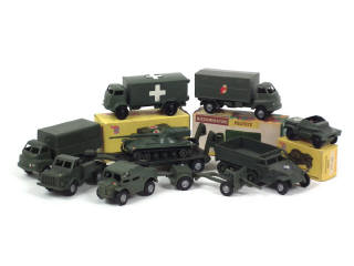 comprend : camion fourgon-ambulance (2 exemplaires différents dont un avec un décalque incomplet), plateau bâché (état 'B' - manque pneu de secours - traces d'oxydation sur les axes de roues), SCOUT CAR, tracteur d'artillerie avec remorque & canon (boîte état 'e' - axes de roues oxydés), HALF TRACK, THORNYCROFT transport de char & AMX 13 (une chenille coupée) - on y retrouve les marques : POLITOYS & SAM TOYS - 4 modèles sans boîte