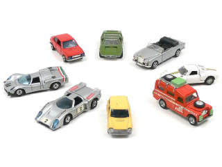 miniatures reproduisant les modèles : IGUANA ITAL DESIGN, AUTOBIANCHI A112 (état 'B' avec une rayure sur le toit), PORSCHE 904 CARRERA GTS (état 'B'), ALFA ROMEO ALFA SUD, SERENISSIMA, CHEVRON GT B16 & ROLLS ROYCE CORNICHE cabriolet (petits manques de chrome sur la calandre) - on y joint une LAND ROVER de marque MEBETOYS